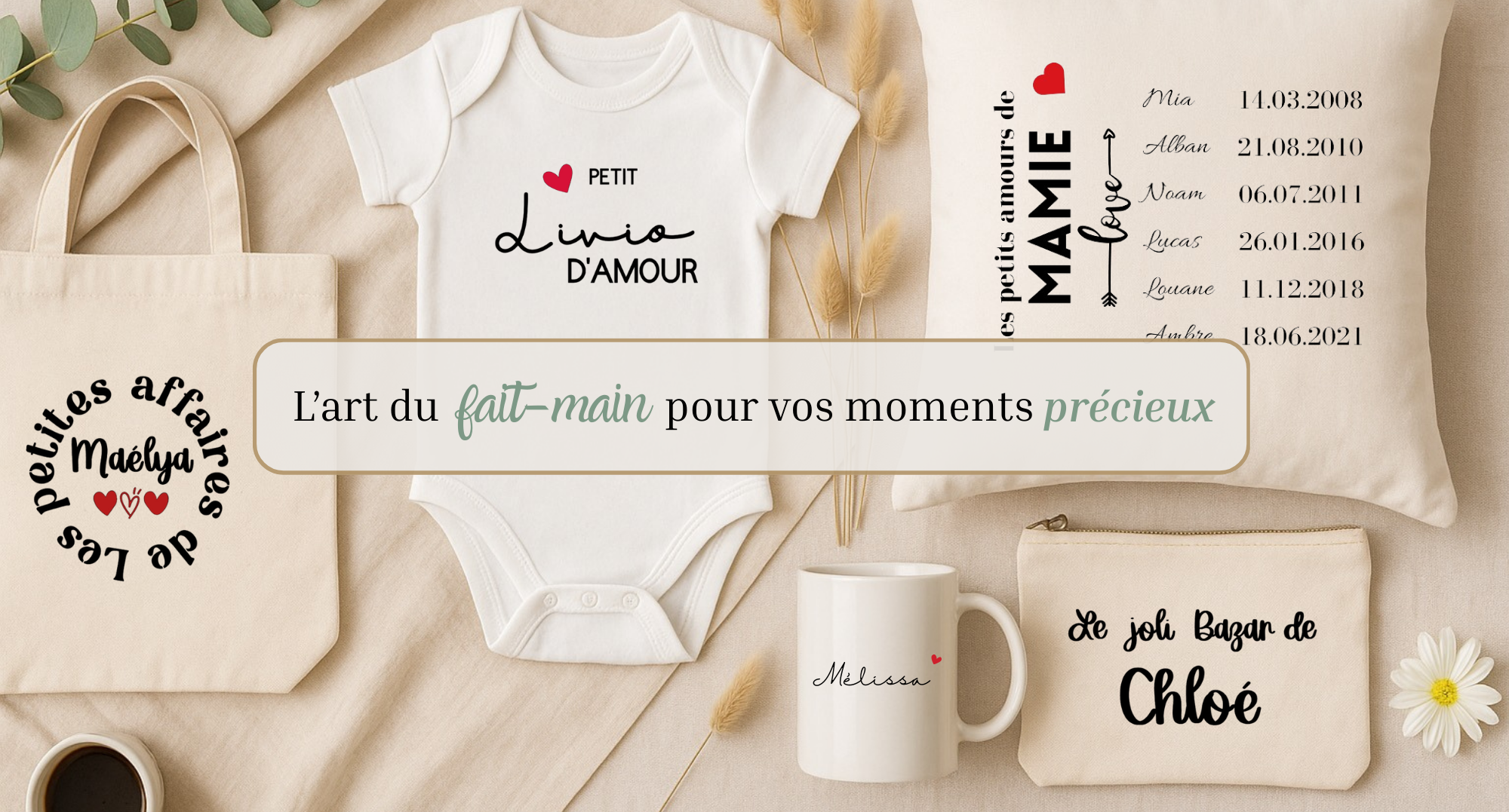 Tote bags, body bébé, tabliers, mugs, cadres ou encore coffrets cadeaux : chaque création est pensée pour être unique et sur-mesure.